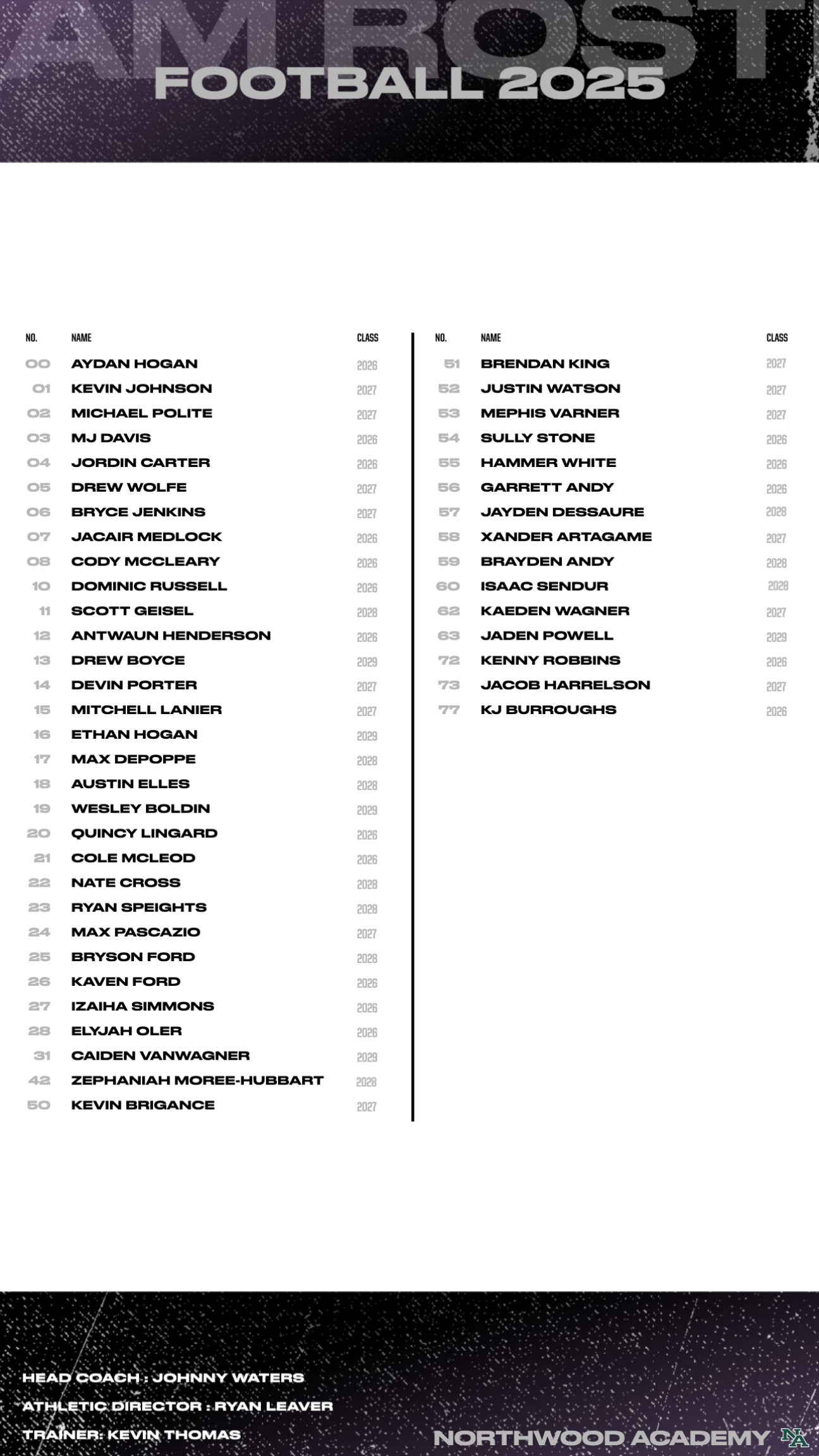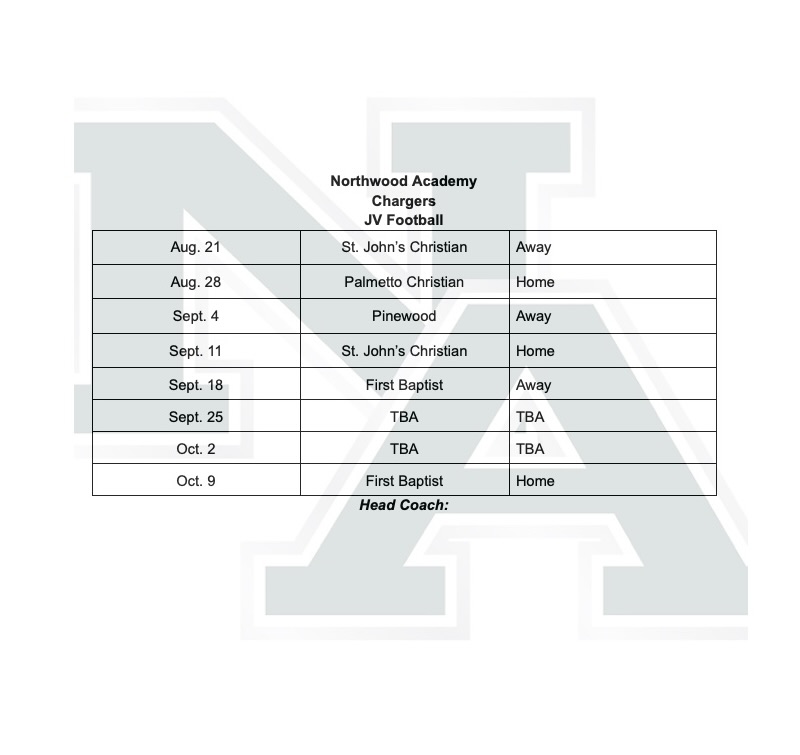 Northwood Academy About Who We Are Administration Business Office Faculty & Staff Pre-school Directory Lower School Directory Upper School Directory Contact Us Northwood Church Academics Upper School AP Capstone Diploma Lower School Pre-school Pre-K Early Ed Two Toddler Infant Resources Ways We Serve Technology Guidance National Organizations Athletics Athletics Teams Archery Cheerleading Cross Country Boys Basketball Girls Basketball Baseball Fishing Football Golf Softball Boys Soccer Girls Soccer Swim Tennis Track and Field Volleyball Wrestling Athletic Trainer Charger Club Lower School Resources Student Life Upper School Lower School Arts Chapel Ways We Serve Resources Resources Family Family Portal Northwood Family App Alumni Staff (Log In) Admissions Why Northwood? Admissions Process Apply to Northwood Tuition & Fees Home / Athletics / Teams / Football Schedule Varsity JV Roster Varsity JV Athletics Teams Archery Cheerleading Cross Country Boys Basketball Girls Basketball Baseball Fishing Football Golf Softball Boys Soccer Girls Soccer Swim Tennis Track and Field Volleyball Wrestling Athletic Trainer Charger Club Lower School Resources Coaches Johnny Waters, Varsity Head Coach(843) 209-5012jwaters@northwoodacademy.com NA Box Office Visit the NA Box Office to purchase your Athletic Event tickets! Support Football Support the Football Team by donating or by becoming a Sponsor. Sponsorship banners are displayed on the field. Donate HereBecome a Sponsor