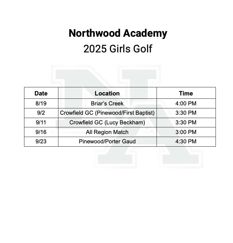 Northwood Academy About Who We Are Administration Business Office Faculty & Staff Pre-school Directory Lower School Directory Upper School Directory Contact Us Northwood Church Academics Upper School AP Capstone Diploma Lower School Pre-school Pre-K Early Ed Two Toddler Infant Resources Ways We Serve Technology Guidance National Organizations Athletics Athletics Teams Archery Cheerleading Cross Country Boys Basketball Girls Basketball Baseball Fishing Football Golf Softball Boys Soccer Girls Soccer Swim Tennis Track and Field Volleyball Wrestling Athletic Trainer Charger Club Lower School Resources Student Life Upper School Lower School Arts Chapel Ways We Serve Resources Resources Family Family Portal Northwood Family App Alumni Staff (Log In) Admissions Why Northwood? Admissions Process Apply to Northwood Tuition & Fees Home / Athletics / Teams / Golf Schedule Girls Team Boys Team Roster Girls Roster Athletics Teams Archery Cheerleading Cross Country Boys Basketball Girls Basketball Baseball Fishing Football Golf Softball Boys Soccer Girls Soccer Swim Tennis Track and Field Volleyball Wrestling Athletic Trainer Charger Club Lower School Resources Coaches Bobby Donnellan, Head Coachbdonnellan@northwoodacademy.com NA Box Office Visit the NA Box Office to purchase your Athletic Event tickets! Support Golf Support the Golf Team with your donation! Donate Here