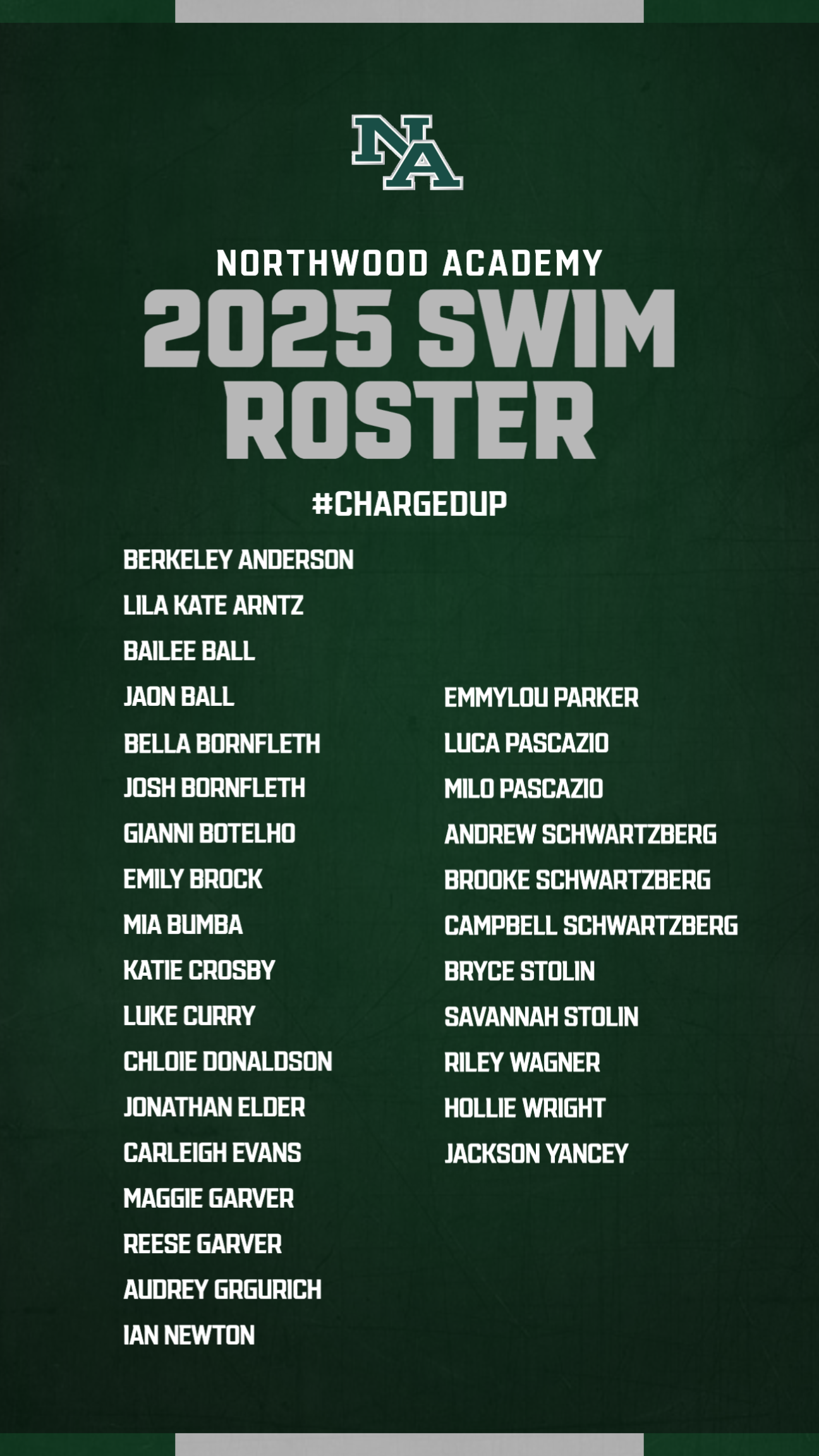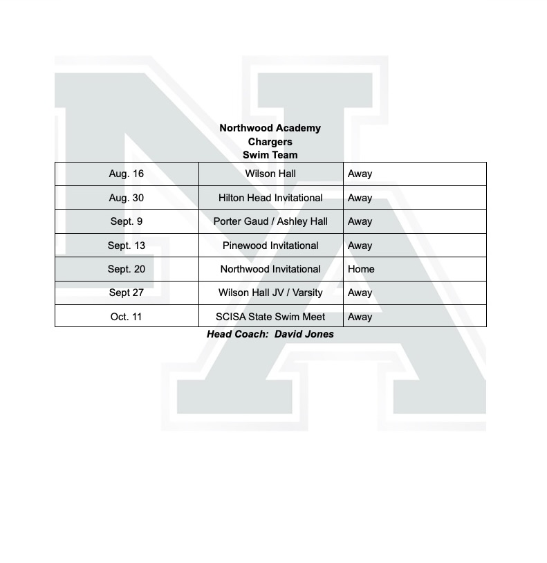 Northwood Academy About Who We Are Administration Business Office Faculty & Staff Pre-school Directory Lower School Directory Upper School Directory Contact Us Northwood Church Academics Upper School AP Capstone Diploma Lower School Pre-school Pre-K Early Ed Two Toddler Infant Resources Ways We Serve Technology Guidance National Organizations Athletics Athletics Teams Archery Cheerleading Cross Country Boys Basketball Girls Basketball Baseball Fishing Football Golf Softball Boys Soccer Girls Soccer Swim Tennis Track and Field Volleyball Wrestling Athletic Trainer Charger Club Lower School Resources Student Life Upper School Lower School Arts Chapel Ways We Serve Resources Resources Family Family Portal Northwood Family App Alumni Staff (Log In) Admissions Why Northwood? Admissions Process Apply to Northwood Tuition & Fees Home / Athletics / Teams / Swim Schedule Roster Athletics Teams Archery Cheerleading Cross Country Boys Basketball Girls Basketball Baseball Fishing Football Golf Softball Boys Soccer Girls Soccer Swim Tennis Track and Field Volleyball Wrestling Athletic Trainer Charger Club Lower School Resources Coaches Dave Jones, Head Coachdjones@northwoodacademy.com NA Box Office Visit the NA Box Office to purchase your Athletic Event tickets! Support Swim Support the Swim Team with your donation! Donate Here